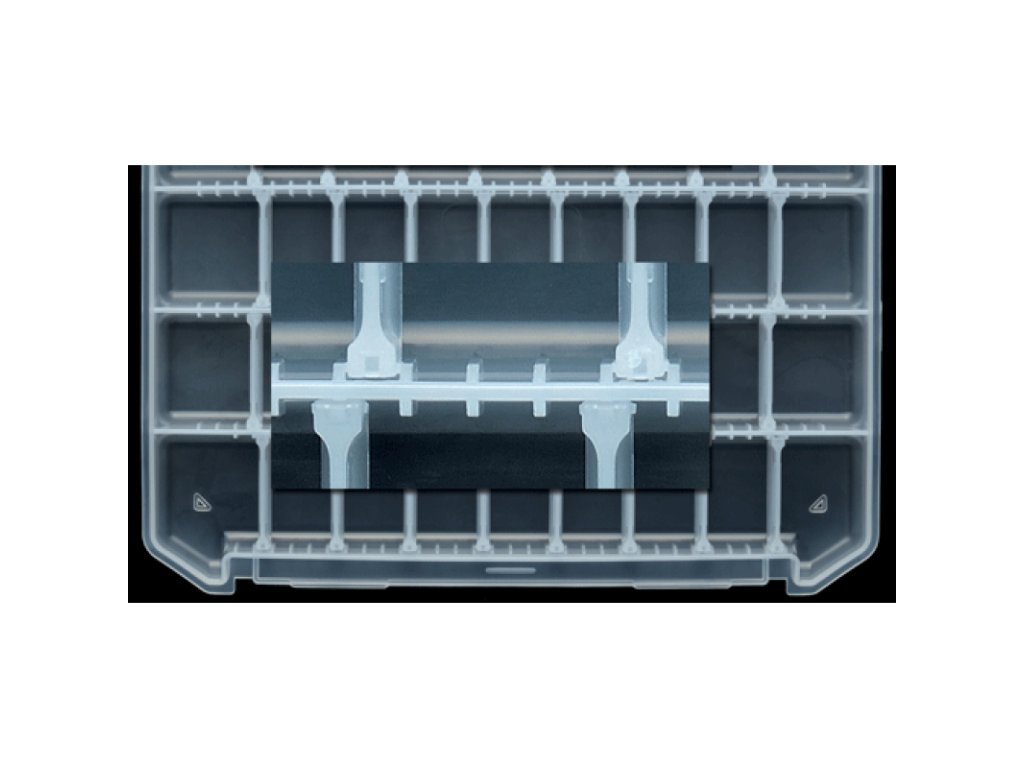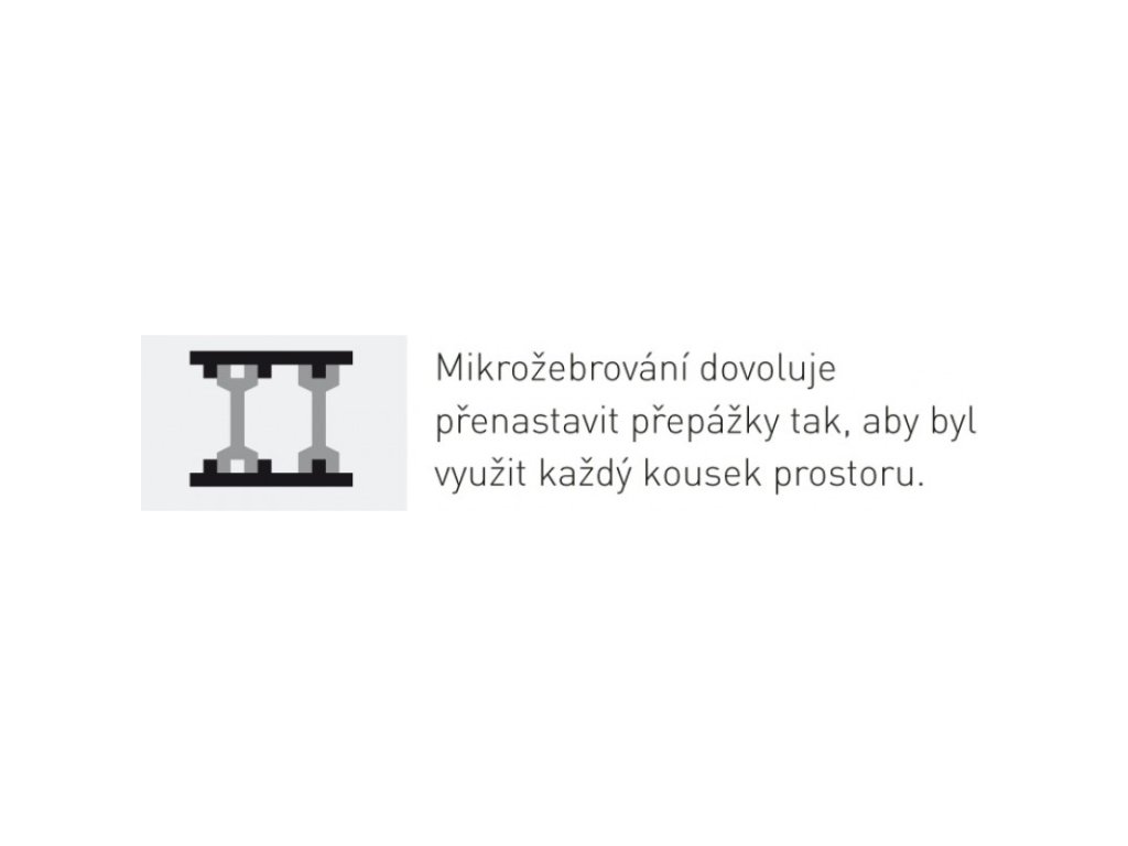 16 variabilních přepážek. Materiál: Polypropylen, zámek ABS. Worm Proof. Mikrožebrování dovoluje přenastavit přepážky tak, aby byl využit každý kousek prostoru.