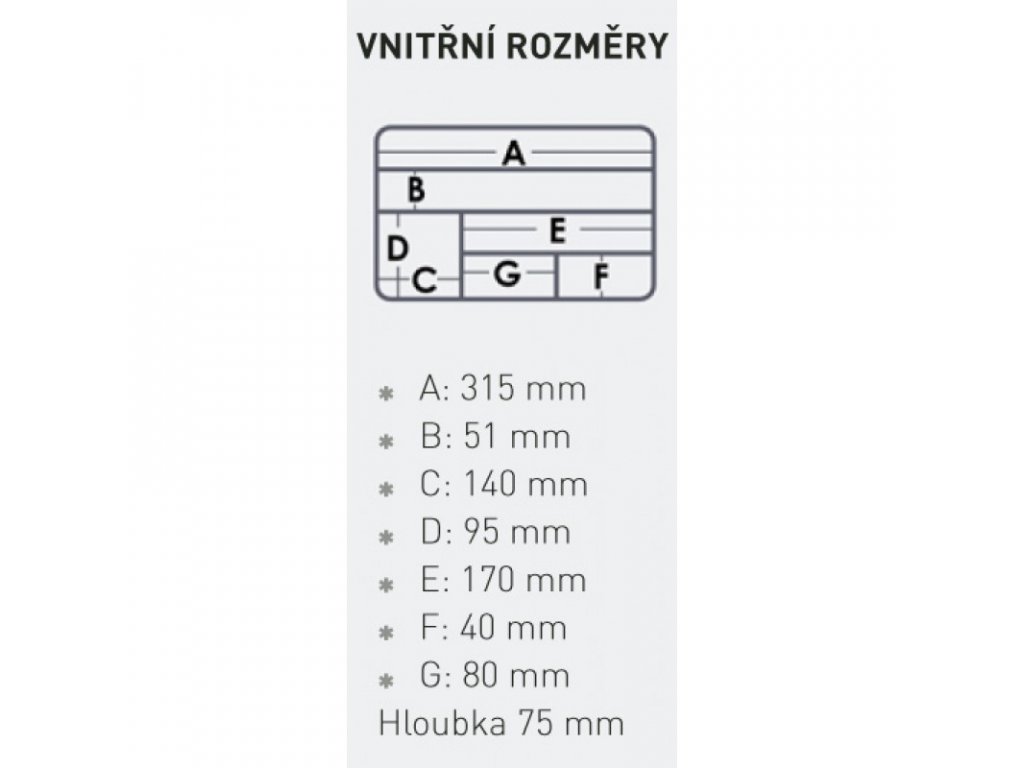 2 variabilních přepážek + 2 variabilní přepážky na třpytky a wobblery. Materiál: Nárazuvzdorný kopolymer polypropylenu - Worm Proof, víko ABS.
